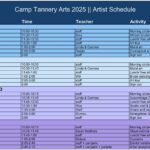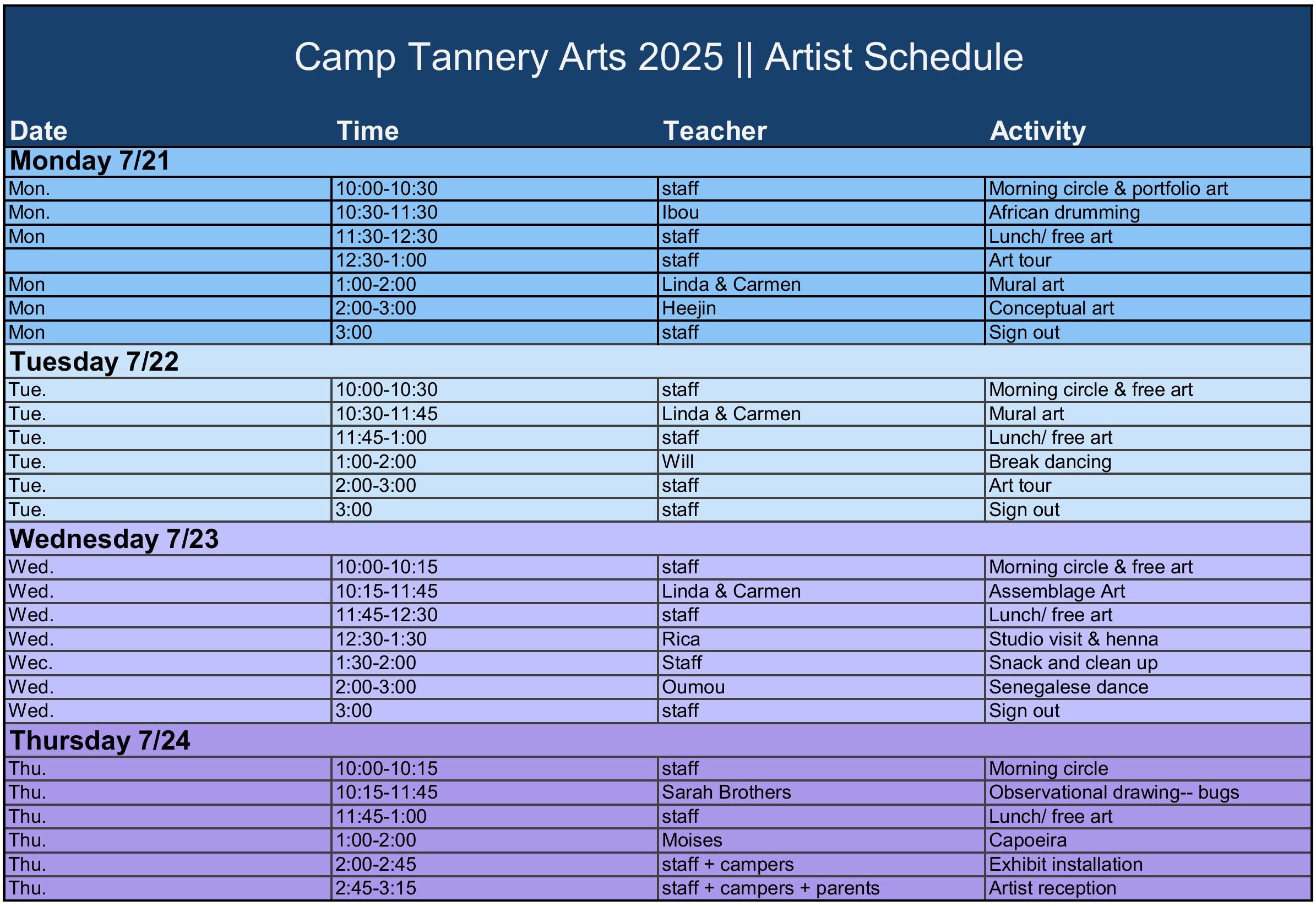 While our camp schedule is usually not finalized until just before the camp, these schedules from past camps will give you an idea of what to expect! We can promise that each camp is unique and packed with wonderful artists from the Santa Cruz Tannery community. Each session will feature different artists, meaning that students who sign up for only one session (morning or afternoon) will not complete every project– that’s ok! We end every camp with a special art exhibit for the families of campers.